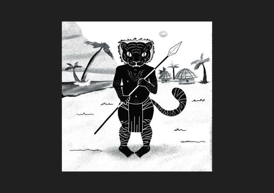 prompt: digital drawing with charcoal texture of a tiger-headed warrior holding a spear on a tropical island with palm trees and huts