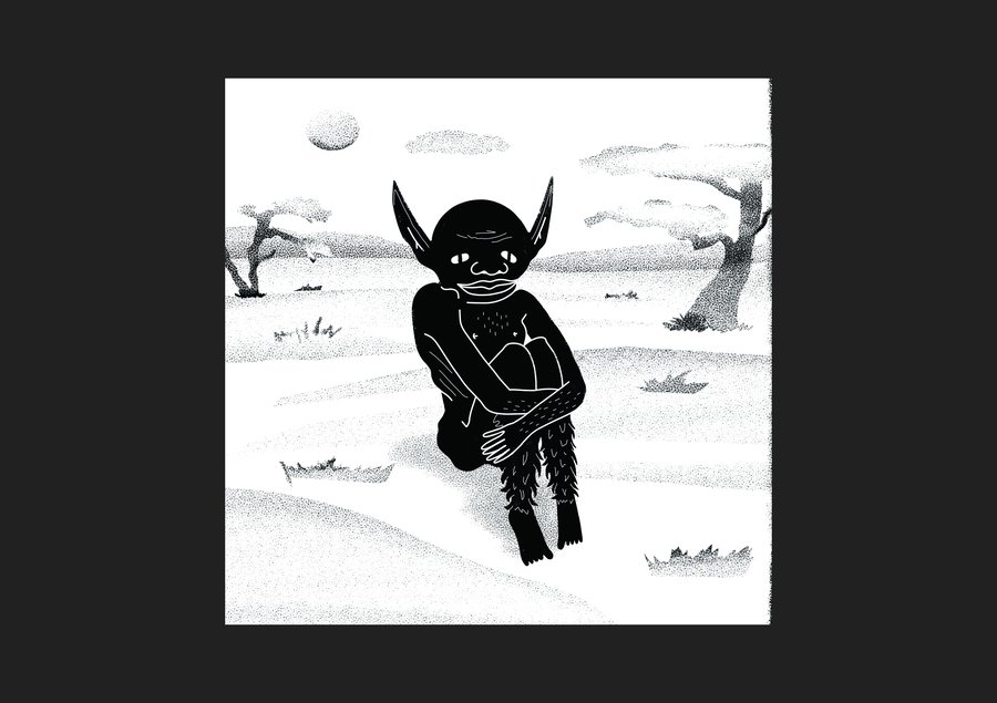 prompt: digital drawing with charcoal texture of a small goblin-like figure with long ears sitting alone in a dry savanna under the sun