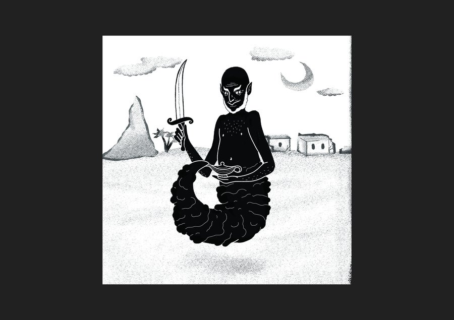 prompt: digital drawing with charcoal texture of a genie-like figure with pointed ears holding a curved sword in a desert vi