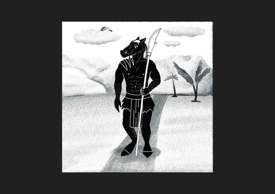 prompt: digital drawing with charcoal texture of a humanoid creature with a horse’s head standing in a windy desert landscape, holding a long weapon