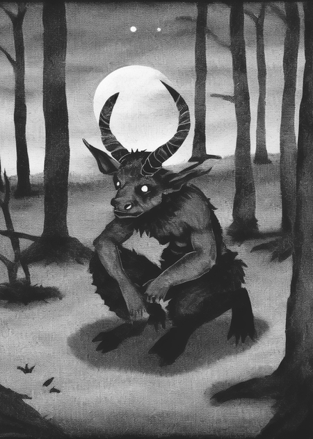 prompt: digital drawing with charcoal texture of a horned forest creature crouching under the moonlight among tall trees