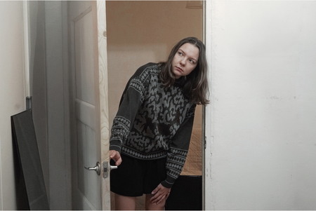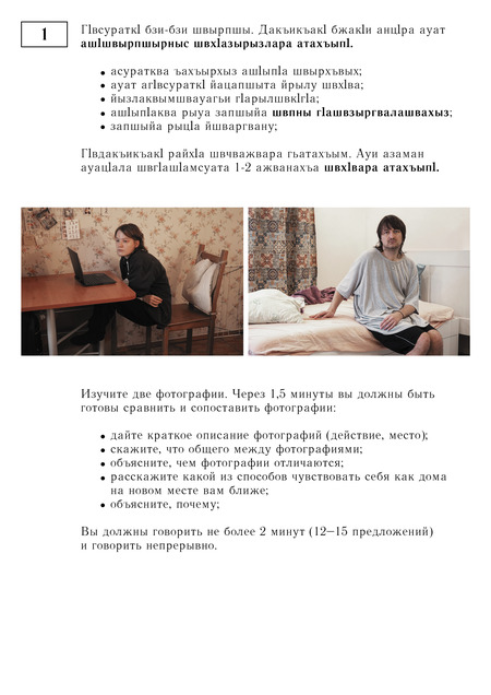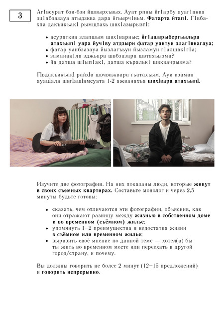 В серии фотографий я использую формат языковых упражнений, заимствованный из типичных учебников по изучению языка. В каждом задании зрителю предлагается составить монолог, отвечая на заданные вопросы. Визуальным сопровождением этих заданий становится серия фотографии — я снимаю своих знакомых и родственников в их съёмных квартирах.