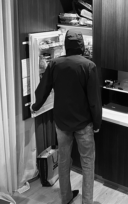 Наконец под утро дверь дома открывается и заходит неопознанный человек в черном капюшоне. Все стараются не дышать, чтоб не спугнуть незнакомца. Он проходит на кухню и, как все и ожидают, на носочках идёт к холодильнику, открывает его и берёт ту самую сметану, захватив еще с полки и хлеб Елены. Внезапно преступник оборачивается и замечает мигание поставленной камеры в верхнем углу комнаты. Он пускается в бегство.