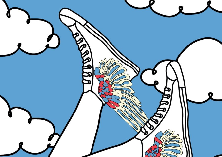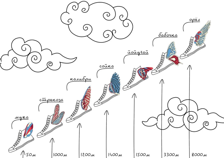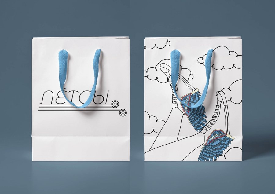На первом курсе я придумала и создала фирменный стиль для бренда летающих кед, в котором высота полёта ботинка зависит от высоты полёта птицы/насекомого, чье крыло стало прототипом крыла на кедах.
