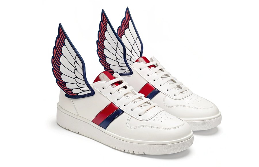 Промт для продукции: «A line of white flying sneakers with red and dark blue elements and wings. The wings are inspired by the wings of birds and butterflies».