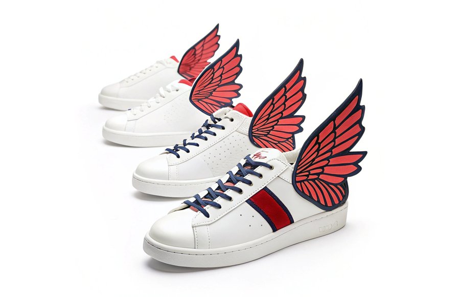 Оба варианта: «A line of white flying sneakers with red and dark blue elements and wings. The wings are inspired by the wings of birds and butterflies».