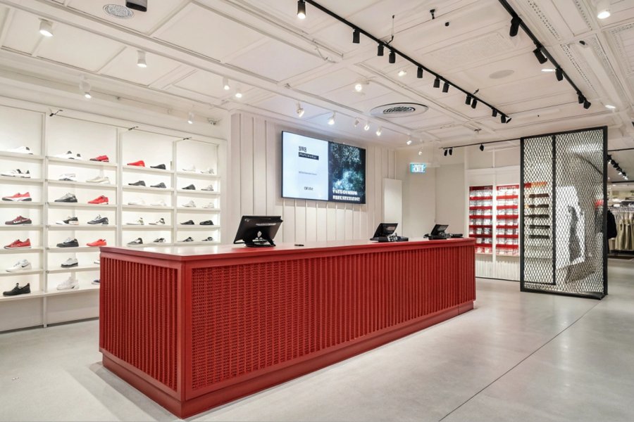2. Выставление размера 3:2 Промт: «The image shows the interior of a modern minimalist shop room. The central place is occupied by a red metal counter with a minimalist design. Behind it are shelves with sneakers. Above the counter is a large screen displaying graphics. On the counter is a computer and a cash register. The white ceiling is decorated with built-in lighting that create a soft and even light». Параметр персональной палитры при генерации.