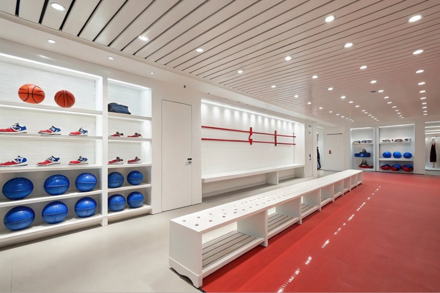 3. Выставление размера 3:2 Промт: «The image shows the interior of a modern minimalist shop room. In the foreground is a long plastic white bench with a modern industrial look. The white ceiling is decorated with elegant stripes of recessed lighting that create a soft and even light. Along the white wall are shelves with blue basketballs and red toy airplanes, which are well lit for better visibility. The floor is red». Параметр персональной палитры при генерации.