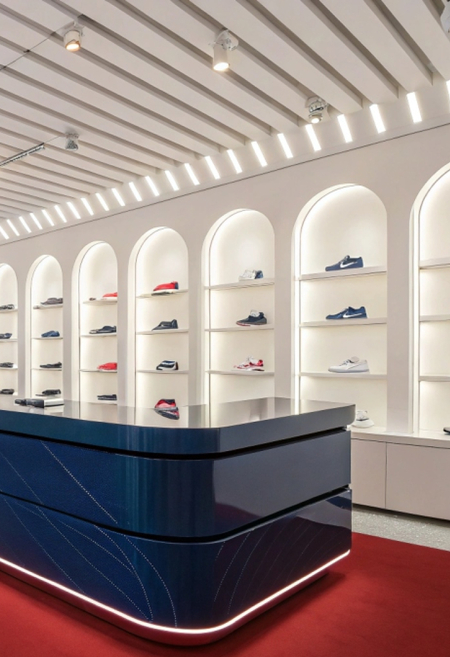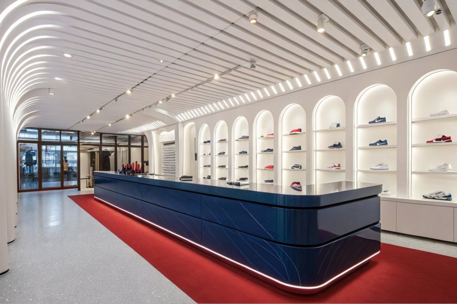 1. Выставление размера 3:2 Промт: «The image shows the interior of a shop room in a modern futuristic style. The main element of the room is a long dark blue counter with smooth, glossy surfaces. The white ceiling is decorated with elegant stripes of built-in lighting that create a soft and even light. On the white walls there are shelves with sneakers. The floor is red». Параметр персональной палитры при генерации.