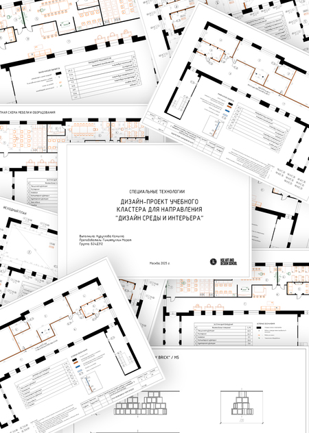 Интерьер направлен на создание вдохновляющего пространства для дизайнеров среды и интерьера, где графичные изображения в стиле чертежей подчеркивают принципы эргономики и формируют визуальную идентичность.