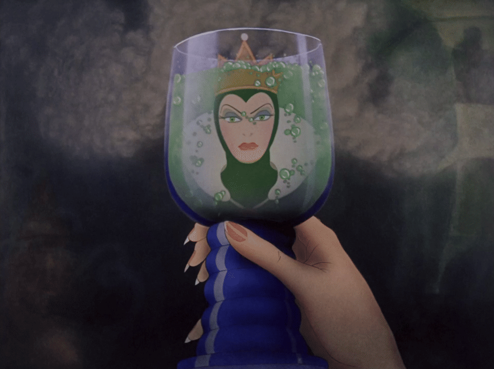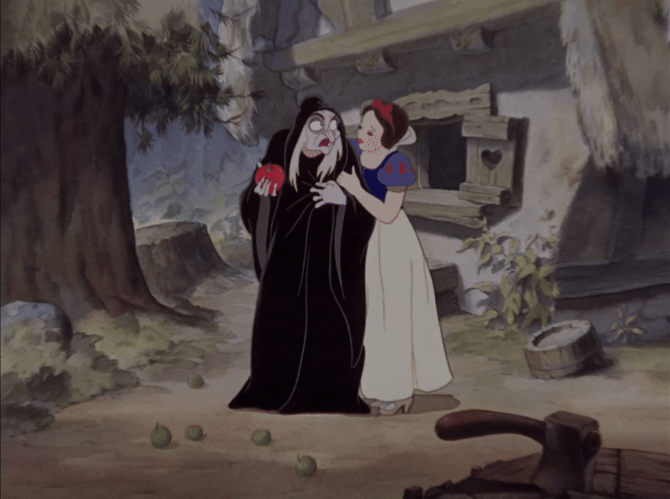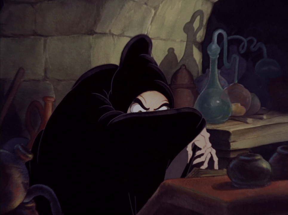 Злая Королева в «Белоснежка и семь гномов» 1937 г. (реж. Дэвид Хэнд, студия Walt Disney Animation) представляет собой классическую злодейку из сказок, красивая женщина с точеными чертами лица, выражающими холод и жестокость. Она превращается в жутко выглядящую старуху с такими же, как у нее до превращения, зелеными глазами. Для зрителей с самого начала очевидно, что она — антагонист.
