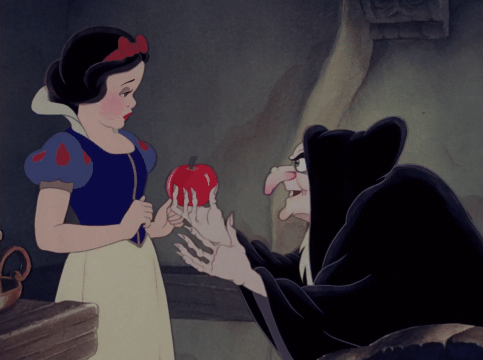 В сценах с Белоснежкой жуткая Старуха визуально контрастирует с героиней, которая не распознает в ней угрозу.