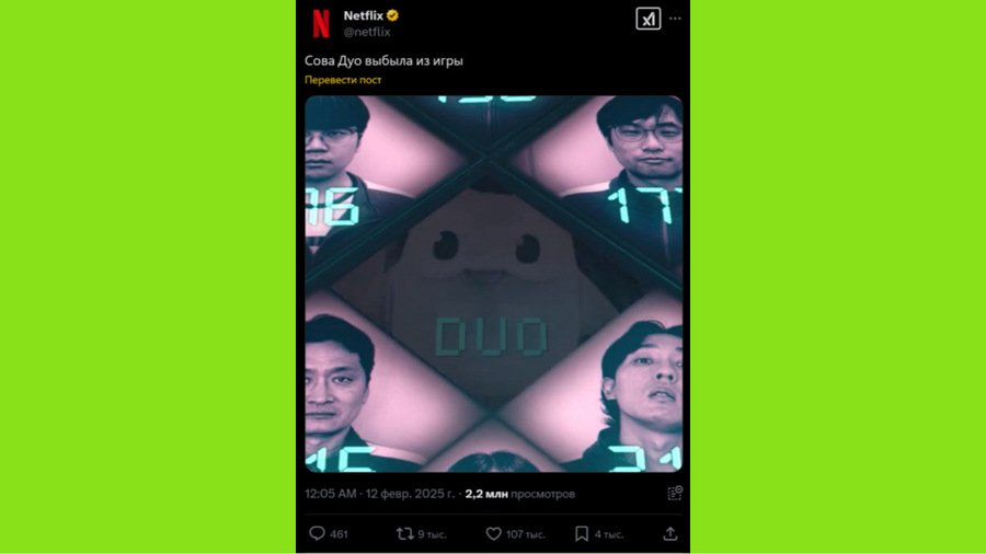 Duolingo активно следует трендам и ведёт свои социальные сети. Год назад, в преддверии новому сезону популярного сериала «Игра в Кальмара» Duolingo выложили танец под ремикс саундтрека к сериалу. Танец стал вирусным.
