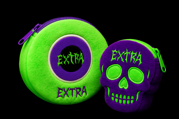 Promt: Create a composition of two cosmetic bags of different sizes in the shape of a plush eye and a skull. The material is soft. Use the colors from the attached files. Bright, saturated neon colors, green, and purple.