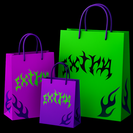 Promt: reate a composition of 3 bags of different sizes, use the colors and font from the attached files, bright saturated neon colors, green, purple.