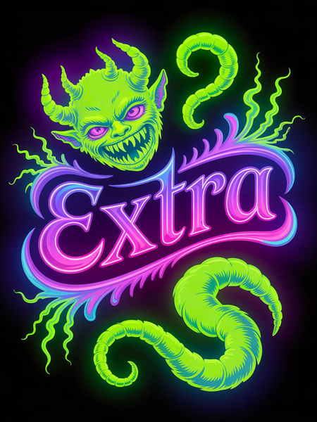 Promt: Generate a poster for a monster-inspired cosmetics brand. It features a realistic style, bright neon colors, purple, green, and pink. The brand is Extra, and the font is Gothic.