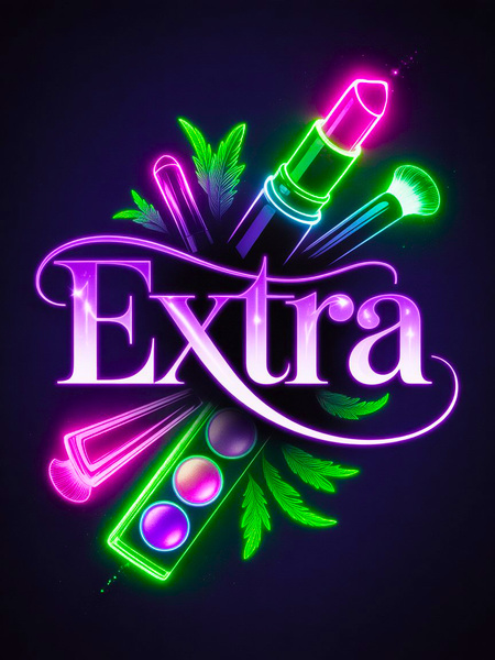 Promt: Create a logo for a bright neon cosmetics brand — Extra. The font is Gothic, with lots of serifs. Use rich, vibrant colors like green and pink.