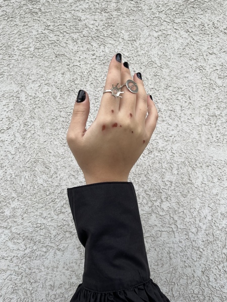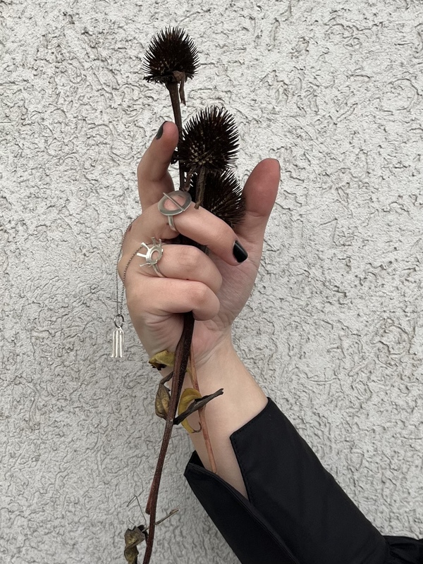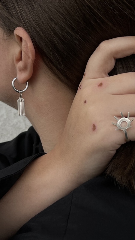 Коллекция ювелирных украшений «Гексабиты» объединяет формы морского ежа и железобетонных ограждений, воплощая синтез ощущений угрозы и безопасности. Искусственно созданные ограждения, также как и иглы морских ежей, выполняют оградительную, оборонительную функции. Работая с обоими образами, в этой коллекции я также отражаю размышления о чувствах уязвимости и защищенности, пытаясь найти и воплотить баланс между ними.