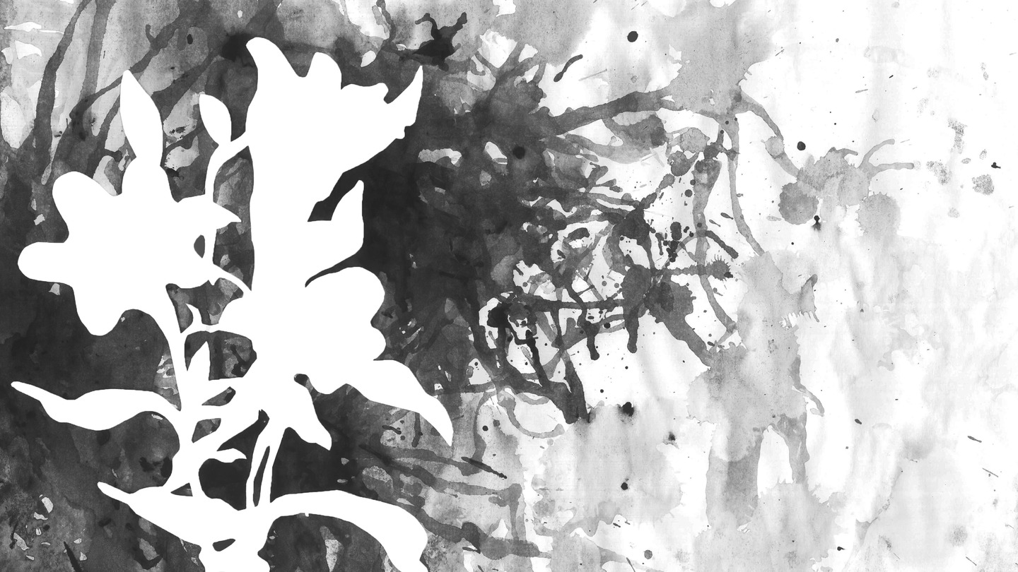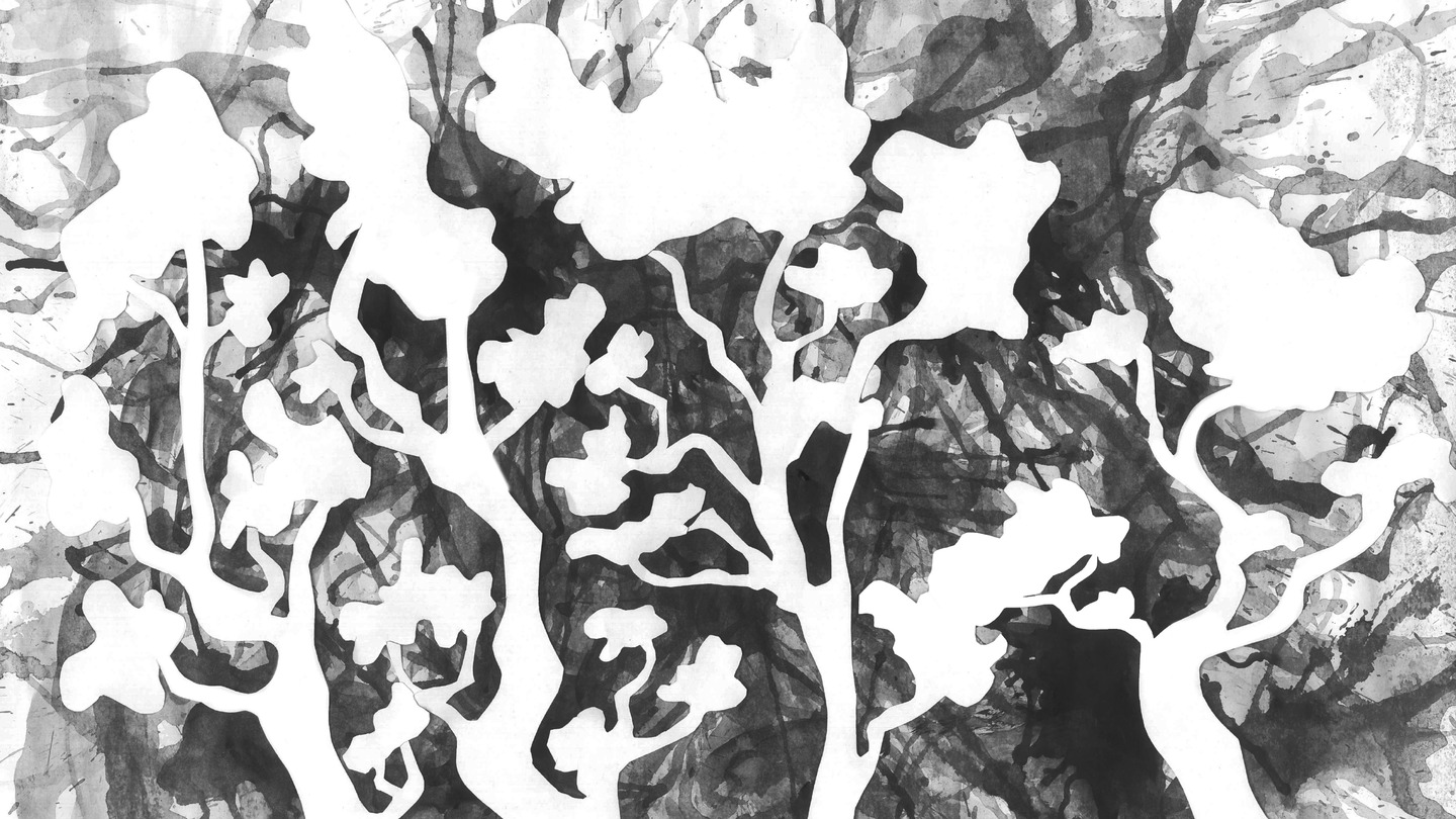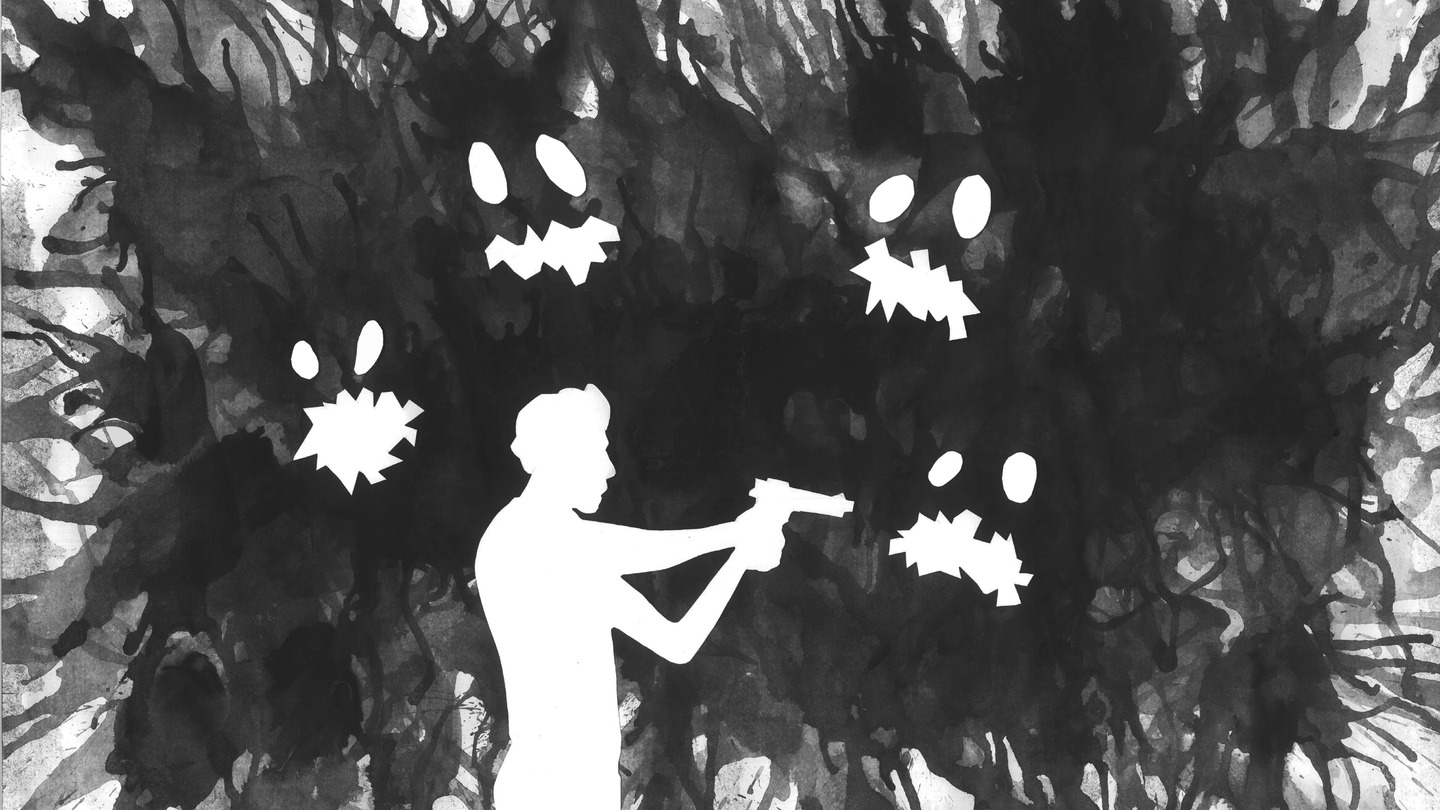 Первая часть иллюстраций — белые силуэты на фоне чёрных разводов.