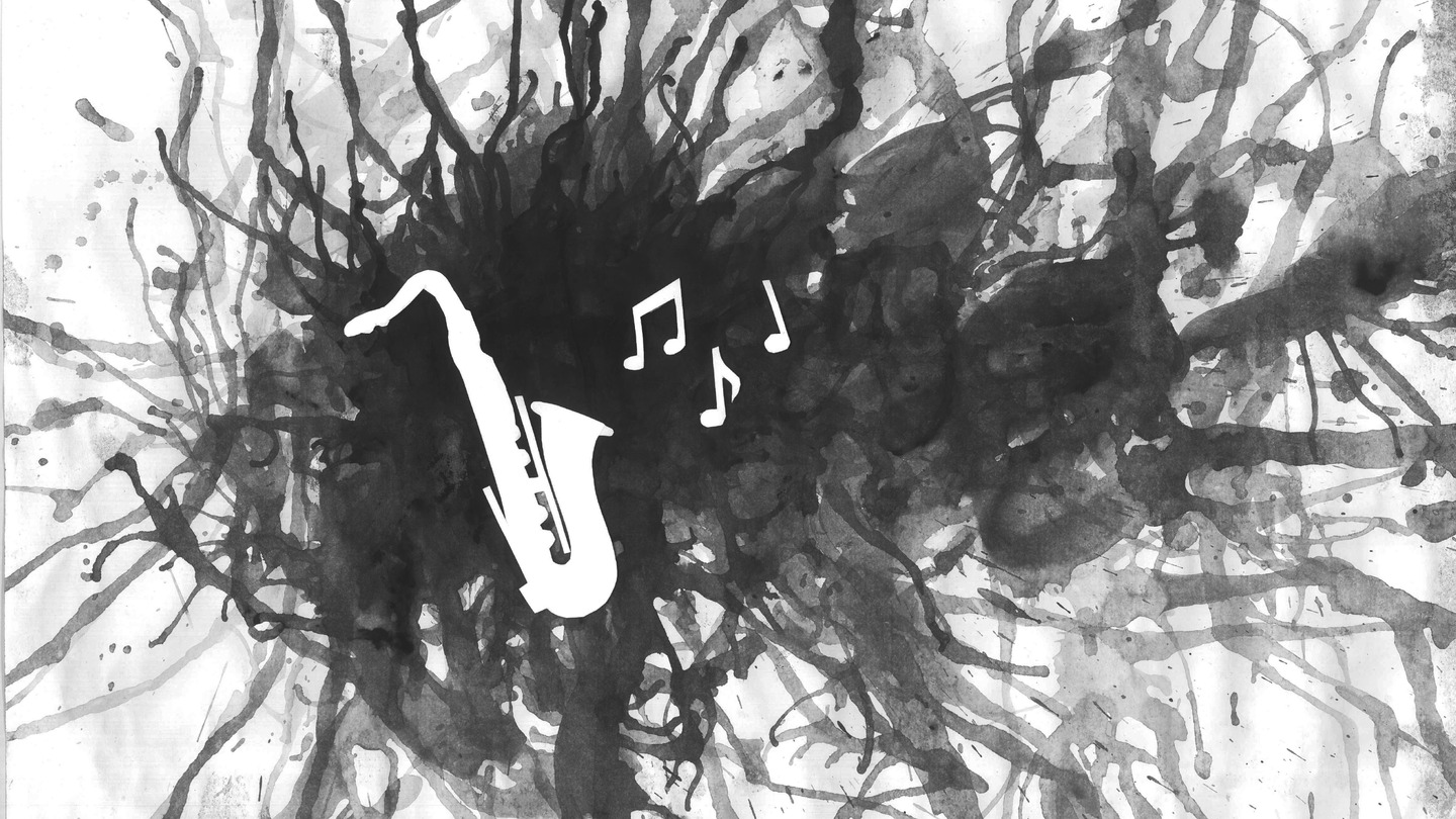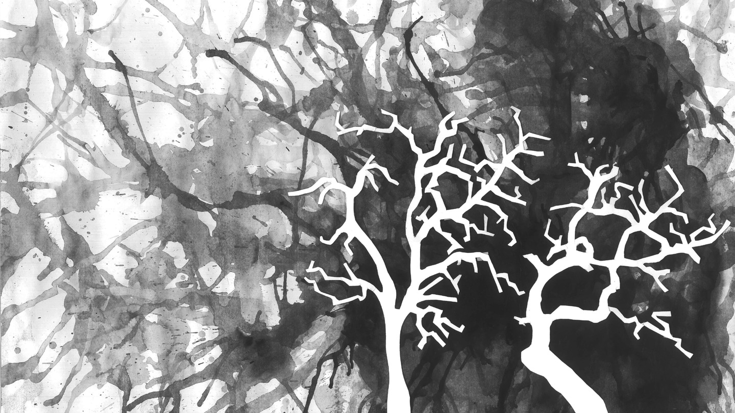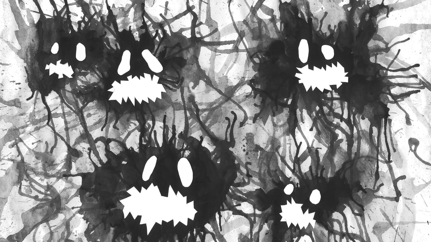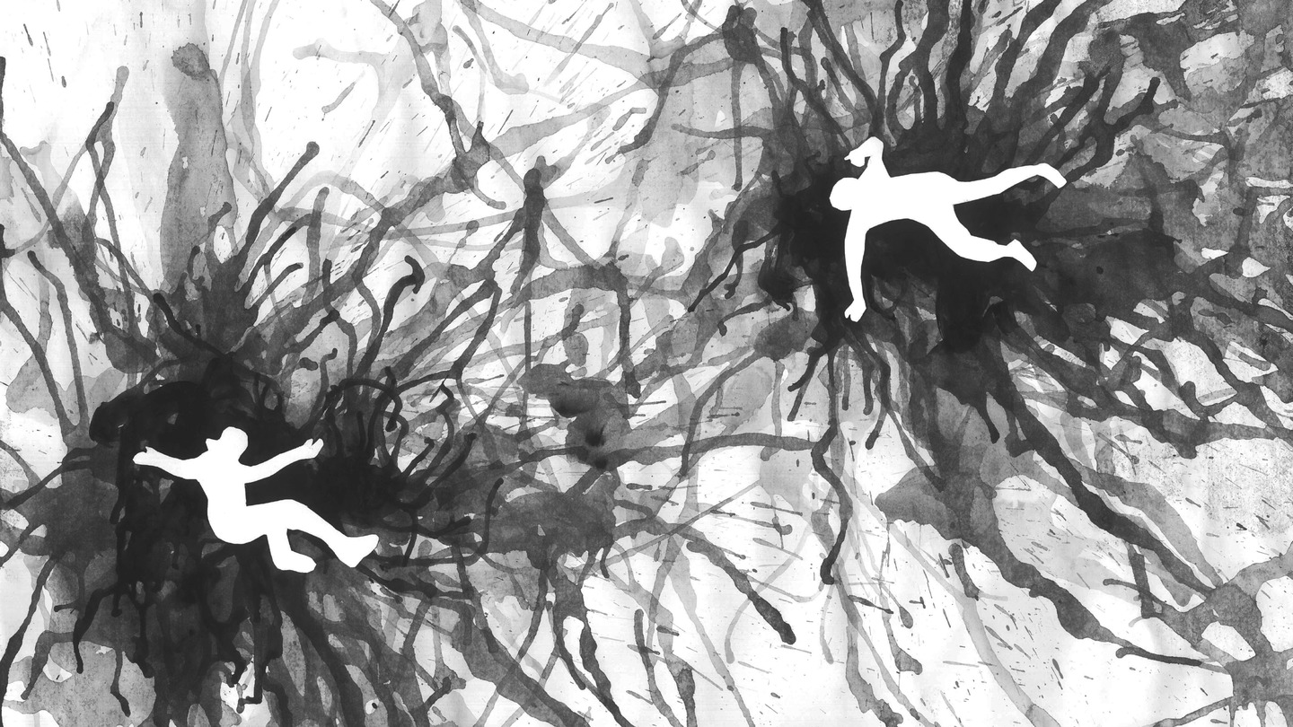 Вторая часть иллюстраций — чёрные разводы в силуэтах, показывают становление героя.