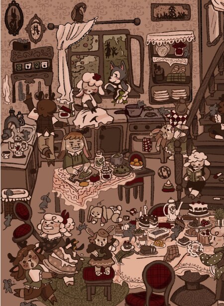 «Зверята» — виммельбух о бытовых ситуациях из жизни беззаботных зайчиков, барашков и других милых животных. Вместе они устраивают пикники, семейные застолья, ловят бабочек и дарят цветочки. Повседневность зверят наполнена уютом, спокойствием и всеобъемлющим дружелюбием.