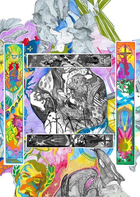 «Под одним небом» — это серия иллюстраций в жанре виммельбух на тему рая и ада в моей личной интерпретации. На первом разворота изображён райский сад, на последнем все круги ада, а на промежуточном столкновение двух сторон.