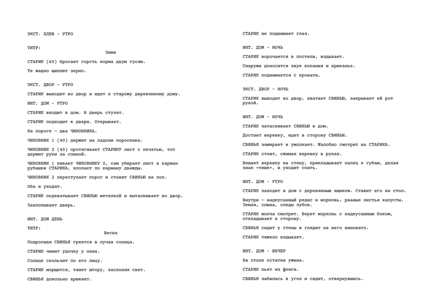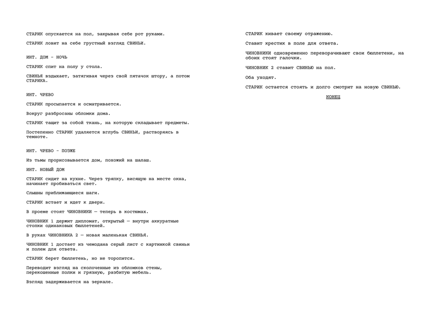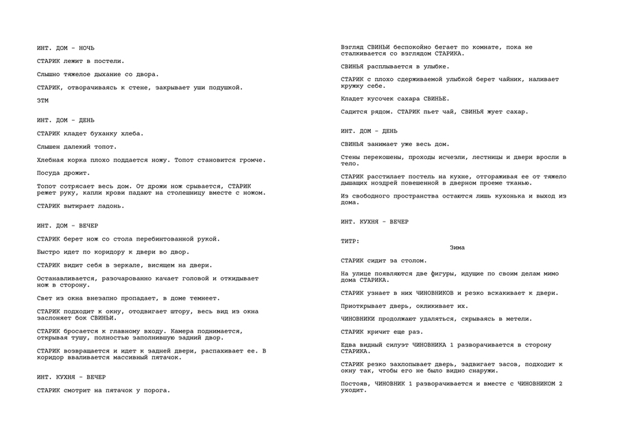 Февраль. В дом пожилого мужчины приходят чиновники и по распоряжению оставляют у него свинью. Со временем животное растет: занимает двор, загораживает окна и проникает в дом. Мужчина приспосабливается, оставаясь в уголке кухни за тонкой занавеской. В один момент всё исчезает — герой оказывается внутри чрева свиньи и пытается устроить быт уже там. Позже чиновники возвращаются снова, процедура изменилась, но результат остается прежним.