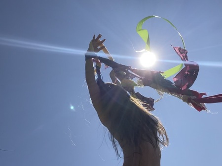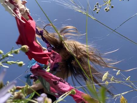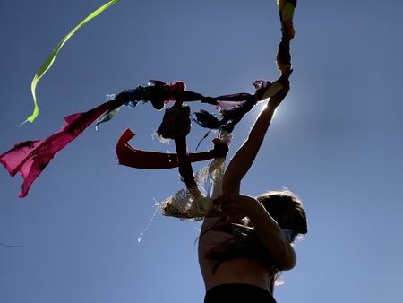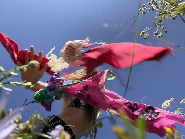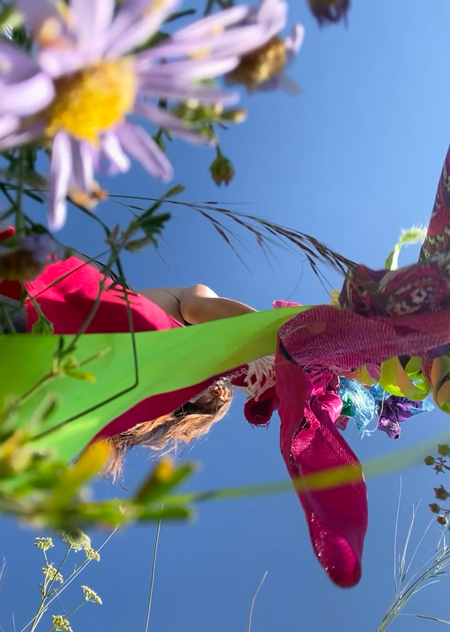 «сВЯЗЬ» исследует эмоциональное тело как поле, где боль можно собирать и коллекционировать. Яркие фрагменты лоскутов из семейного сундука сплетаются в узлы-спазмы. Для меня важна перформативная случайность и непредсказуемость процесса: во время плетения и во время движения. Эта случайность очень точно отражает настоящее чувствование — тонкое и неуловимое