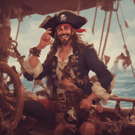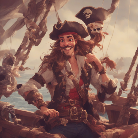 1. portrait in justinecunha style, happy man pirate on the boat 2. portrait in justinecunha style, happy pirate on the boat, 8k