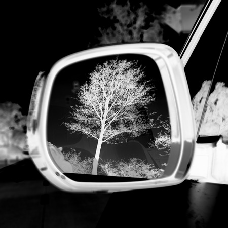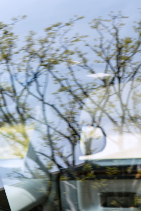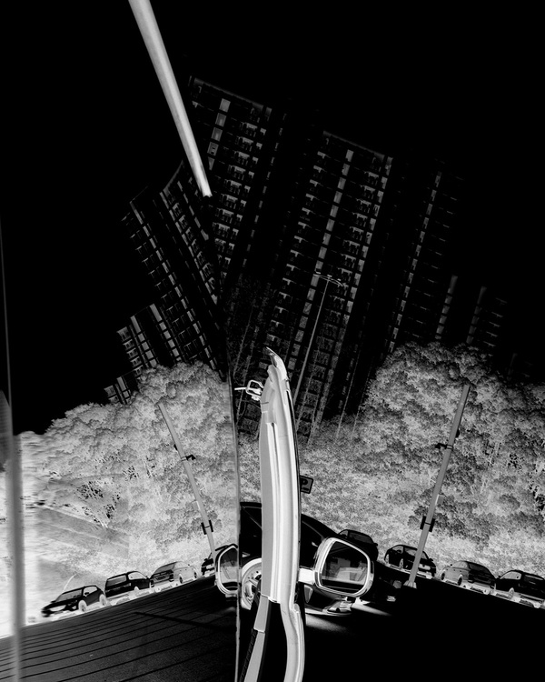 This work captures a world reflected in the metallic surfaces of car bodies, enhanced by chromatic inversion editing techniques. The surreal visual effect transports viewers into a sci-fi experimental film, where vehicles emerge one after another from the edge of the clouds.