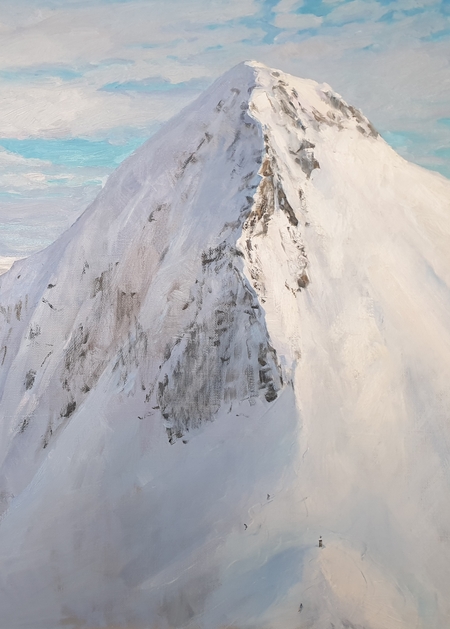 Картина родилась на этапе исполнения моей мечты, давно мечтала освоить сноуборд так, чтобы покататься в горах и спускаться по снежным склонам выше облаков.