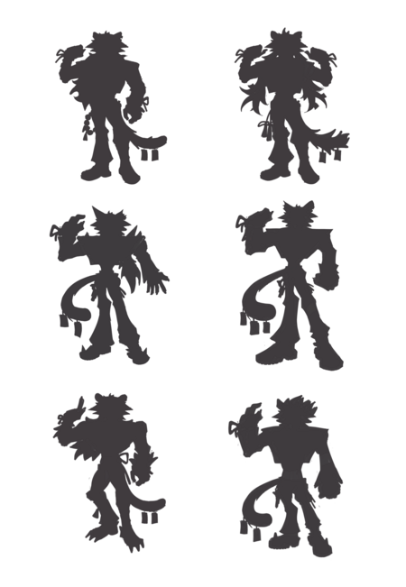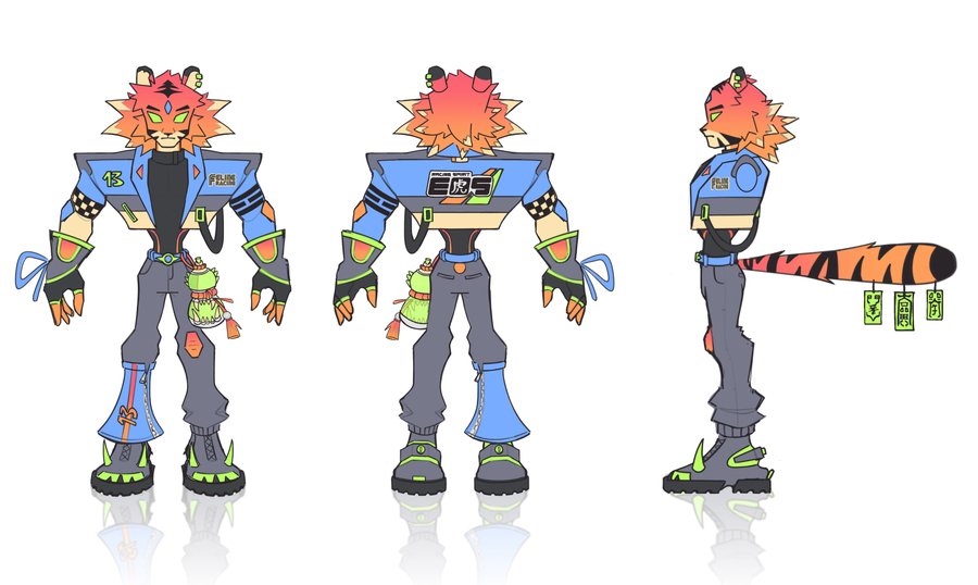 Было довольно трудно определиться с цветовой палитрой персонажа. Изначально планировалось сделать цвета приглушёнными и естественными, так как казалось, что персонажу духу с довольно мрачной предысторией не подойдут пёстрые цвета. Однако в ходе проб стало понятно, что гонщики слишком сильно ассоциируются с яркой палитрой, и без неё «гоночность» героя не считывается.