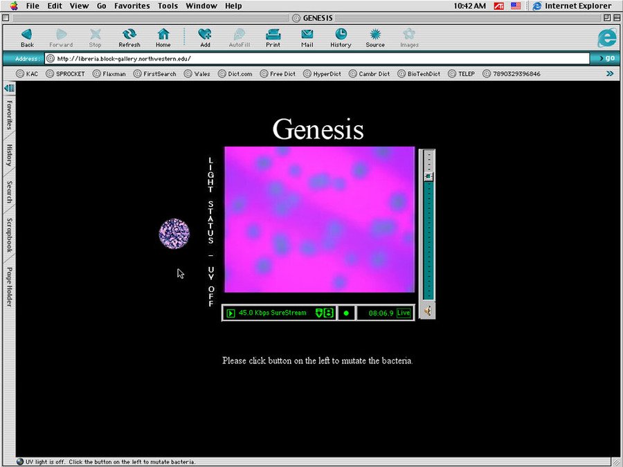 Ген Творения был добавлен в бактериальную среду в чашке Петри, которая была выставлена в галерее. Посетители, включая и выключая ультрафиолетовый свет, влияли на состояние бактерий в чашке, что вносило изменения в библейский текст. При этом зрители окружены текстуальной составляющей со всех сторон: на стены транслируется вид чашки Петри, похожую на гигантский глаз, и текст из Библии в нескольких версиях, включая коды.