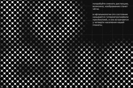 The project addresses the subject of the perception of text and image, depending on the distance and condition of the visual system. The poster was based on a visual metaphor of long-sightedness: from a close distance, the image seems vague and unreadable, but the key word «focus» appears in the distance. It’s a principle that refers to the features of an eye accompaniment in hypermetropy, when the image’s focus is formed behind a retina, and it’s easier for a person to distinguish remote objects than close ones. Far-sightedness is one of the most common visual impairments. According to the World Health Organization, more than 1.5 billion people suffer from various forms of presbiopia and hypermetropy. However, many learn about the diagnosis only at a time when the need to reschedule a book or screen becomes part of everyday experience.
