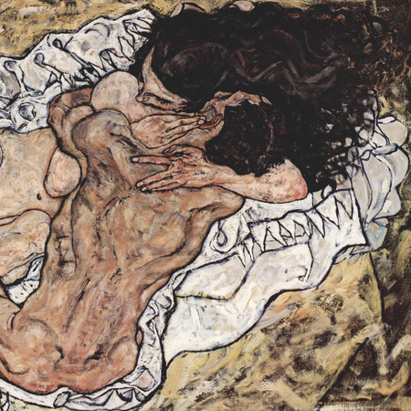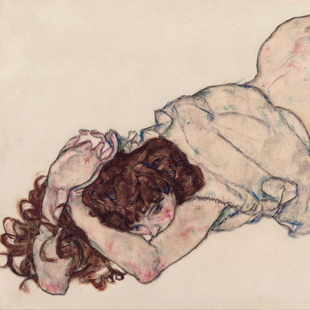 Эгон Шиле, «Девушка на коленях, опирающаяся на оба локтя», 1917 / «Обнимающаяся пара » 1917