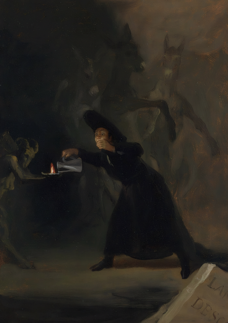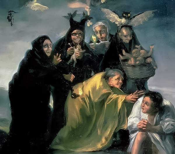 В «Заклинании» Гойя создаёт сцену, в которой сверхъестественное не является самостоятельной силой — оно рождается внутри человеческого сознания и поддерживается коллективной фантазией. Ведьмы и колдуны, изображённые в качестве центральных фигур, представлены не как всесильные существа, а как своего рода театральные актёры, участвующие в ритуале, который питается страхами и доверчивостью окружающих. Их жесты преувеличены, маски искажены, а атрибуты магии выглядят почти карикатурно — всё это превращает «мистику» в спектакль, построенный на манипуляции. Аллегоричность картины раскрывается в том, что Гойя показывает не столкновение с реальным сверхъестественным, а процесс конструирования страха. Сцена напоминает зрителю: любые «злые силы» возникают тогда, когда общество добровольно отдаёт себя во власть суеверий, пропаганды или фанатизма. Ведьмы здесь — не демоны, а метафоры людей, использующих невежество и панические убеждения ради власти, контроля или выгоды.