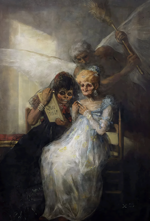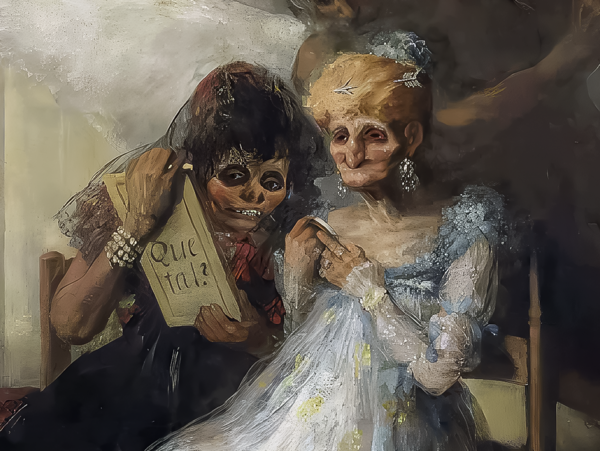 В картине «Старухи» Гойя обращается к теме разрушительной силы времени и к тому, как человеческие слабости продолжают существовать даже тогда, когда их внешние основания уже исчезли. Две женщины, утраченные возрастом и болезнями, всё ещё держатся за условности светской жизни. Их нарядность и манерность подчёркивают внутреннее противоречие: тело уже принадлежит старости, а жесты — всё ещё миру масок и притворства. Особую роль Гойя отдаёт сценической неестественности: изображения старух намеренно гротескны, их лица перегружены чертами, напоминающими карикатуру. Так художник выводит на поверхность то, что обычно скрывается за социальной вежливостью и привычкой украшать реальность. Он показывает не возраст как таковой, а именно иллюзию контроля над временем — попытку жить по правилам прошлого, когда само прошлое уже ушло. Фигура старика, похожего на аллегорию времени и появляющегося за спинами женщин, усиливает ощущение неизбежности. Зритель словно видит, как само время наблюдает за этой комичной и одновременно трагичной попыткой сопротивления. Здесь Гойя использует привычные элементы аллегории, но делает их не величественными, а тревожными, почти призрачными.