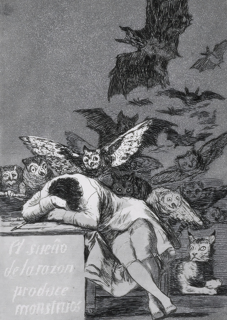 «И спит разум, рождаются чудовища» — один из самых интерпретируемых листов серии. Хотя композиция не изображает мистического события в прямом смысле, её окружение — совы, летучие мыши, кошмары — формирует аллегорический пантеон существ, порождённых человеческой слабостью, невежеством и моральной усталостью. Эти фигуры, лишённые определённого мифологического контекста, становятся универсальными символами глупости, страха, дезориентации и духовной деградации. Гойя здесь использует визуальные формулы сна и ночного духа не для описания сверхъестественной реальности, а для анализа разрушительных последствий неразумия.
