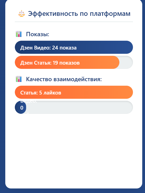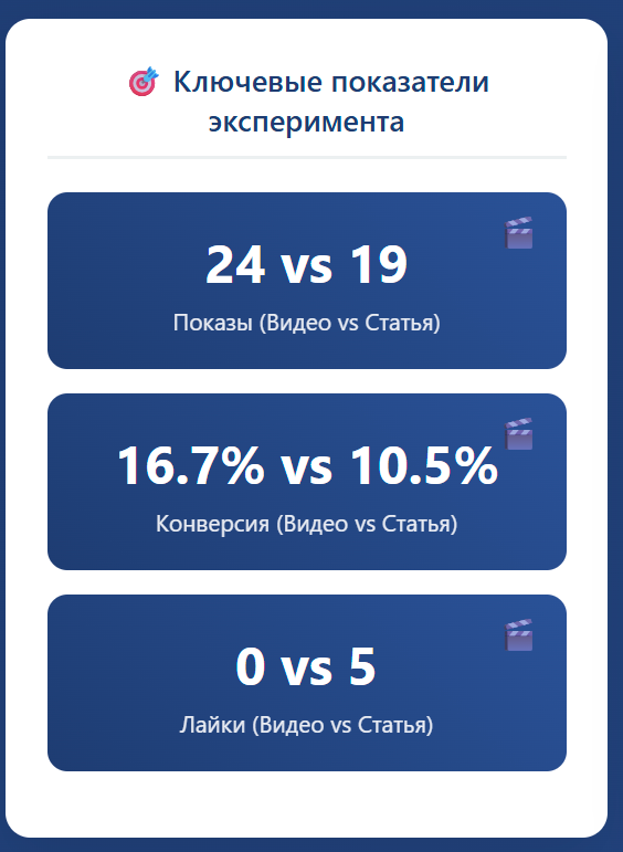 24 показа за период публикации 4 просмотра (конверсия 16,7% от показов) 0 лайков (низкая эмоциональная вовлеченность) 0 комментариев (отсутствие дискуссии) 0 подписок (не привлек постоянную аудиторию) География: 75% Москва, 25% Шайенн (интересная международная аудитория) Анализ эффективности видео показал, что видеоформат получил больше показов, чем статья (24 vs 19), но значительно меньше вовлеченности. Конверсия в просмотры 16,7% сопоставима с дочитываниями статьи, но отсутствие лайков указывает на проблемы с эмоциональным откликом. Причинами низкой вовлеченности могли стать слишком провокационный заголовок, не соответствующий содержанию, недостаточная динамика для 16-секундного формата, отсутствие четкого призыва к действию, а также несоответствие между обещанием заголовка и реальным контентом.