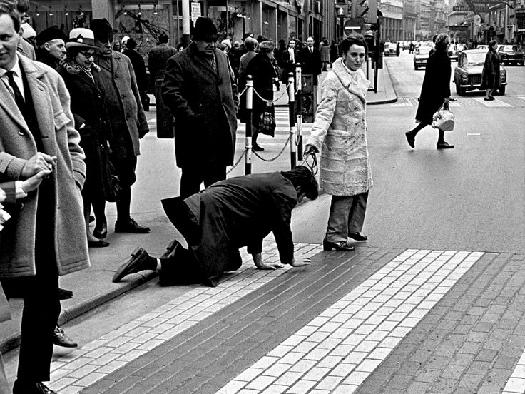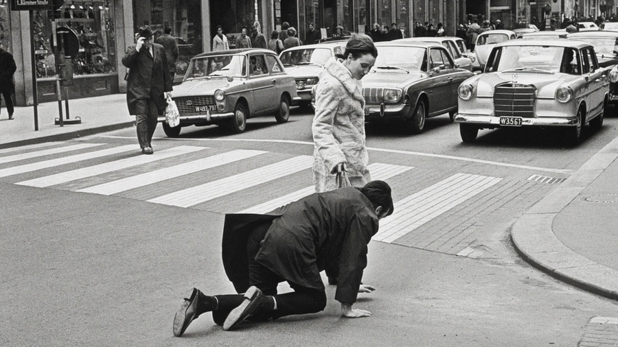 В этом перформансе Вали Экспорт выгуливала Петера Вайбеля. Они оба одеты очень прилично. Особенно Вайбель — как примерный офисный сотрудник. В центре внимания тут именно проблемы общества и положения молодого среднестатистического человека в этом обществе.