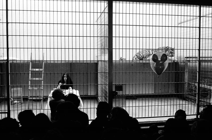 В этом перфомансе художница обедала с тигром в соседней клетке.