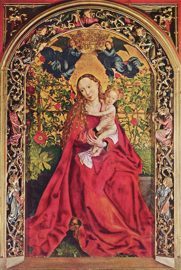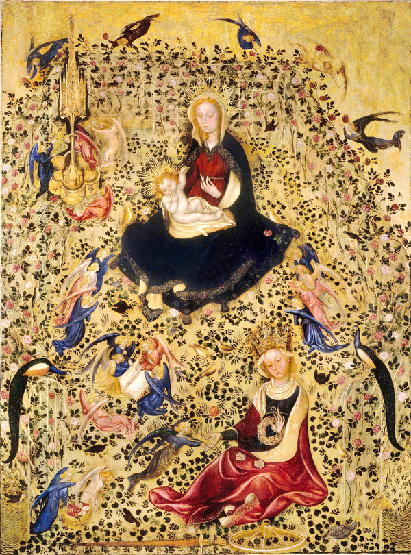 Изображение «Райского сада», или «Сада Марии», неизвестного рейнского мастера XV века, полное христианской символики. Это «сад огражденный». Мария, «Царица Небесная», сидит на подушке, читая, в то время как Сын её играет на земле. Его одежды украшены ирисами, имеющими царственное значение. Непорочность Марии символизируют белые лилии, а любовь к Богу — красные розы. Вишни означают небесную радость, плоды земляники — справедливость, а её тройные листья — Троицу, виноград, растущий поблизости, — древо познания добра и зла. На столе — яблоки, символизирующие грехопадение первых людей и их спасение Христом. Вода в колодце символизирует «живую воду», представляющую собой Богоматерь, лилия на переднем плане изображения означает чистоту, щеглы на ограде — страдания Христа, ибо они имеют пурпурные пятна в своей окраске и питаются зёрнами терния.