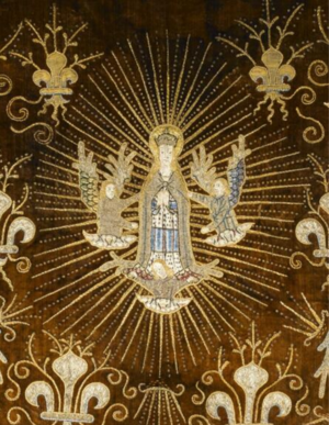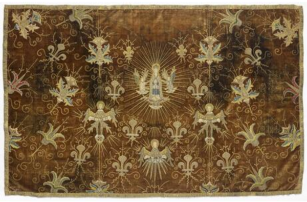 Часть ризы из коричневого бархата (ранее красного), расшитая шёлком и металлическими нитями, изображает Деву Марию, поддерживаемую ангелами, в окружении геральдических лилий и стилизованных цветов: Англия, XV век. Позднее была вырезана и преобразована в алтарную часть.
