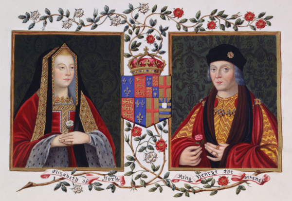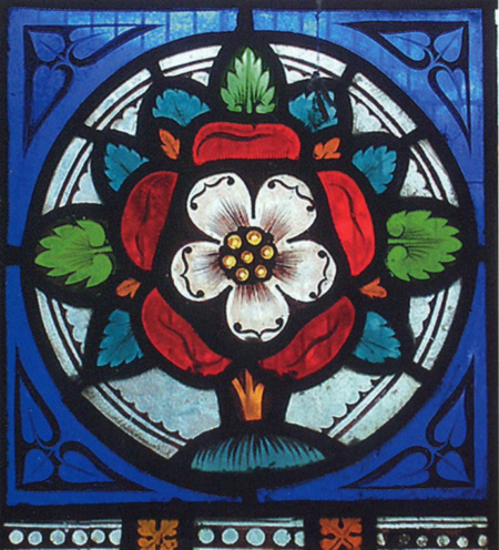 Елизавета Йоркская и Генрих 7, держащие белую и красную розы. Миниатюра начало 19 века. Витраж с изображением Розы Тюдоров