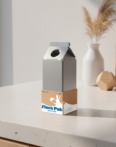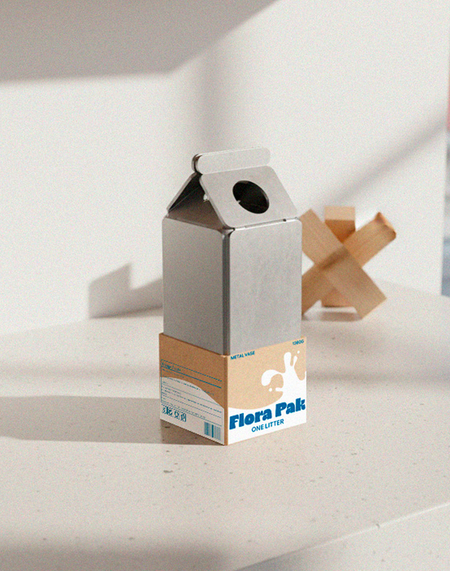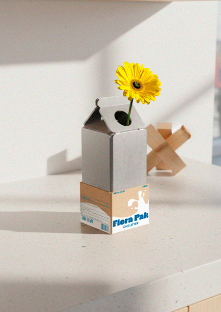Ваза «Флорапак» из металлического листа в форме пакета молока — это функциональный предмет интерьера возвышающий обыденное с отсылкой к поп-арту.