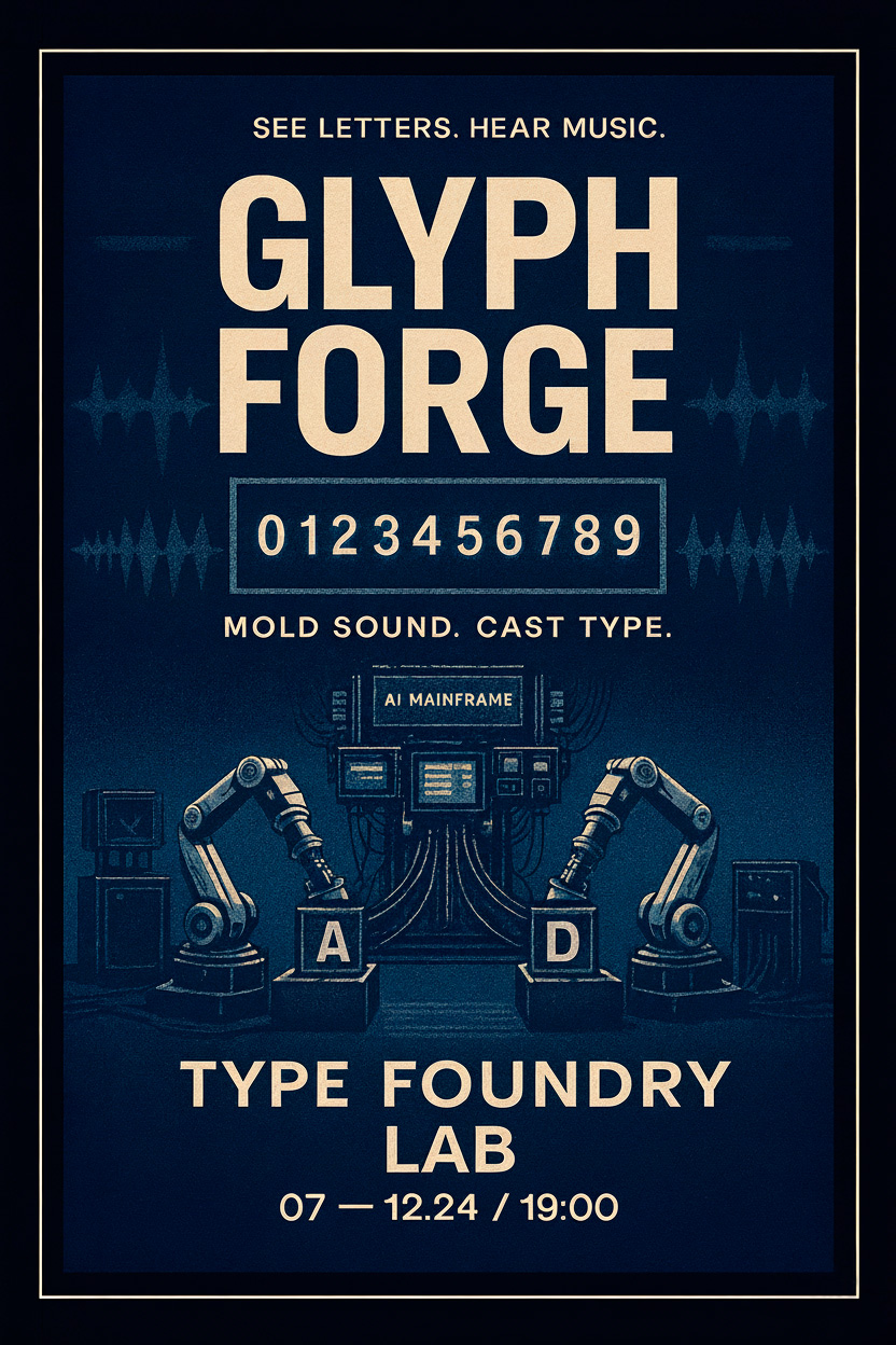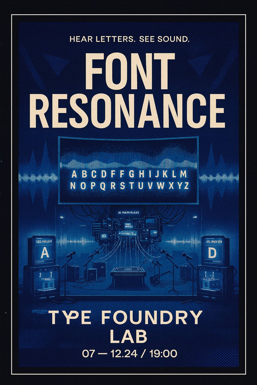 FONT RESONANCE — это лаборатория, где звук превращается в буквы, а буквы — в волну. Голос зрителя рисует спектр, который деформирует шрифт. Тёмно-синие и серые пульсации создают «гребни» и провалы композиции. Резонанс фиксирует гармоники, из которых рождаются глифы: каждый пик — штрих, каждая пауза — кернинг. На выходе — шрифт-осциллограмма: живой, реагирующий на такт, готовый к печати и записи в базу.