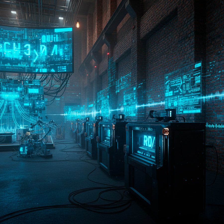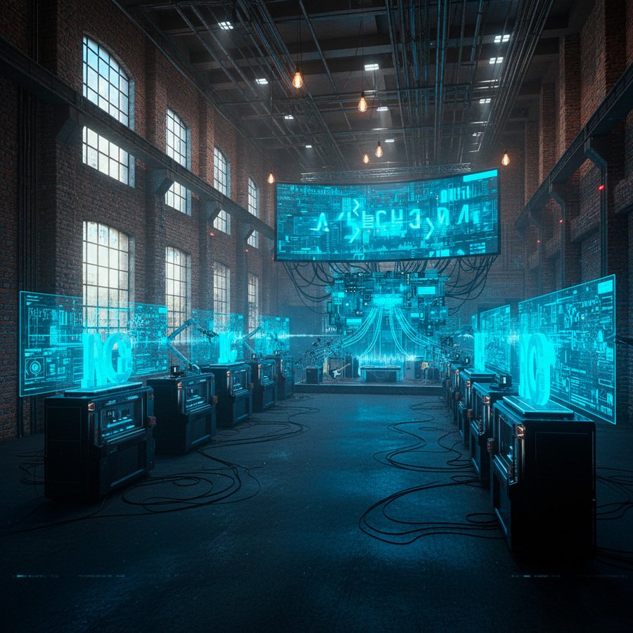 Ключевые элементы концепции: Локация: Огромный, футуристичный, возможно, немного брутальный цех/завод. Центральный элемент: Главный Компьютер/ИИ — сердце «производства». Ввод данных: Сцена с музыкальными инструментами/диджейским пультом и множеством микрофонов для «подачи» музыки в ИИ. Обработка: ИИ анализирует музыкальный поток. Вывод (Продукт): Физический: 3D-печать букв/символов/шрифтов. Цифровой: Проекция сгенерированного шрифта на огромный экран. Дополнительно: Готовый шрифт автоматически добавляется в базу данных компьютера. Итог: Полноценная музыкальная лаборатория шрифтов, где звук материализуется в типографику.