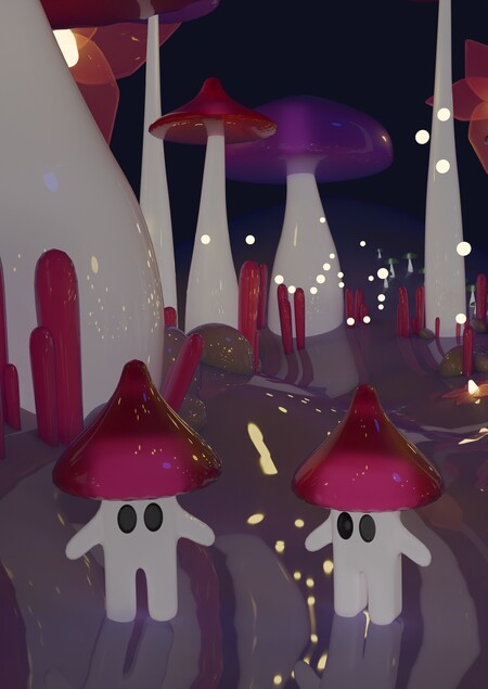Два гриба-обитателя добавляют сцене жизни, превращая безмолвный лес в миниатюрный, мерцающий мир.