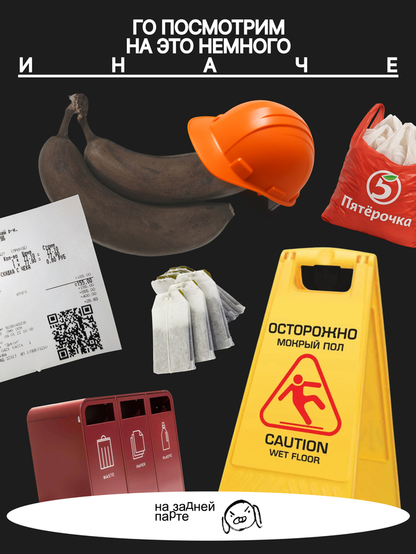 Участники работали с чеками из «Дикси», табличками «Осторожно, мокрый пол», наклейками на мусорные вёдра в фудкортах, стикерами на окна автомобилей, странными утилитарными объектами и бытовыми упаковками. Были задания вроде чехла для пенсионного удостоверения, упаковки для конструктора из кирпичей, пакета для пакета, открытки при покупке дихлофоса или упаковки чая, который слишком долго заваривается
