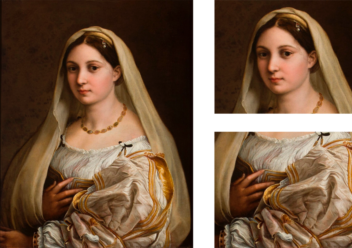 Богатство светлых оттенков, нежное свечение кожи и тонкая передача фактуры и текстуры платья героини в картине «Донна Велата» демонстрируют техническое совершенство художника.